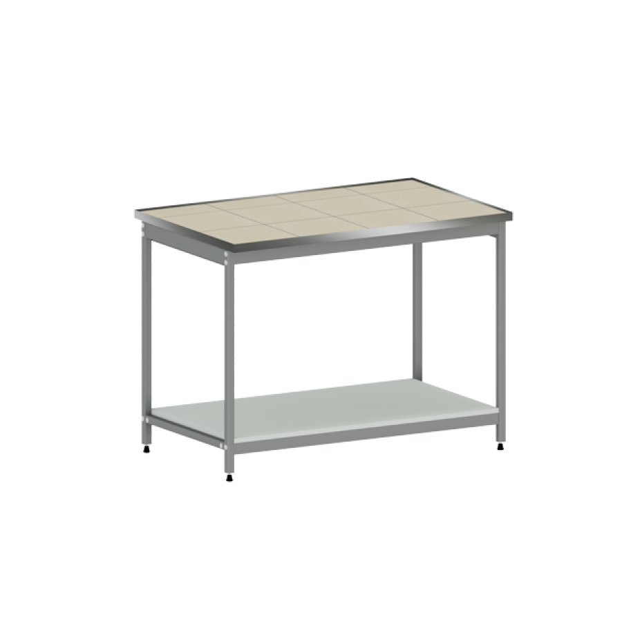 Робоча поверхня (стільниця) Керамограніт 300х300мм наклеєний на вологостійку фанеру 18мм, з бортиком 6мм із нержавіючої сталі.