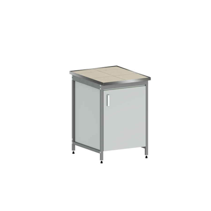 Робоча поверхня (стільниця) Керамограніт 300х300мм наклеєний на вологостійку фанеру 18мм, з бортиком 6мм із нержавіючої сталі.